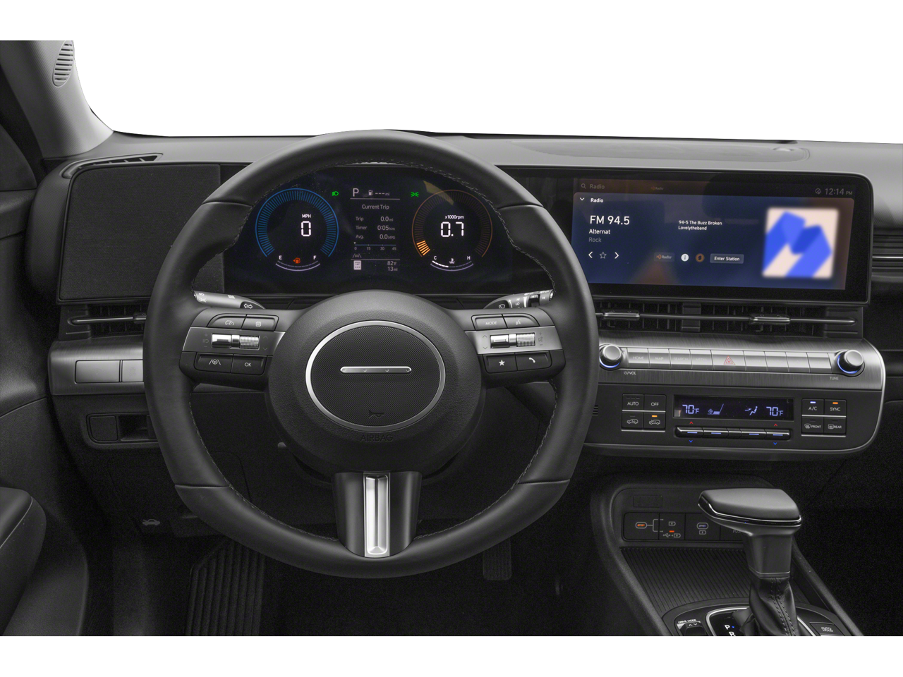 This 2025 Hyundai Kona is equipped with Option Group 01, 4-Wheel Disc Brakes, 6 Speakers, ABS brakes, Air Conditioning, Alloy wheels, AM/FM radio: SiriusXM, Apple CarPlay & Android Auto, Auto High-beam Headlights, Automatic temperature control, Brake assist, Bumpers: body-color, Cargo Blocks, Cargo Net, Cargo Tray, Carpeted Floor Mats, Cloth Seat Trim, Delay-off headlights, Door Sill Plates, Driver door bin, Driver vanity mirror, Dual front impact airbags, Dual front side impact airbags, Electronic Stability Control, Emergency communication system: Bluelink+, Exterior Parking Camera Rear, First Aid Kit, Front anti-roll bar, Front Bucket Seats, Front Center Armrest, Front dual zone A/C, Front reading lights, Front wheel independent suspension, Fully automatic headlights, Heated door mirrors, Illuminated entry, Leather steering wheel, Low tire pressure warning, Occupant sensing airbag, Outside temperature display, Overhead airbag, Panic alarm, Passenger door bin, Passenger vanity mirror, Power door mirrors, Power driver seat, Power steering, Power windows, Radio: AM/FM/HD Radio/SiriusXM Audio System, Rear seat center armrest, Rear window defroster, Rear window wiper, Remote keyless entry, Road Assistance Kit, Security system, Speed control, Speed-sensing steering, Split folding rear seat, Spoiler, Steering wheel mounted audio controls, Tachometer, Telescoping steering wheel, Tilt steering wheel, Traction control, Trip computer, Turn signal indicator mirrors, Variably intermittent wipers, and Wheels: 18 x 7.0J Glossy Black Alloy.