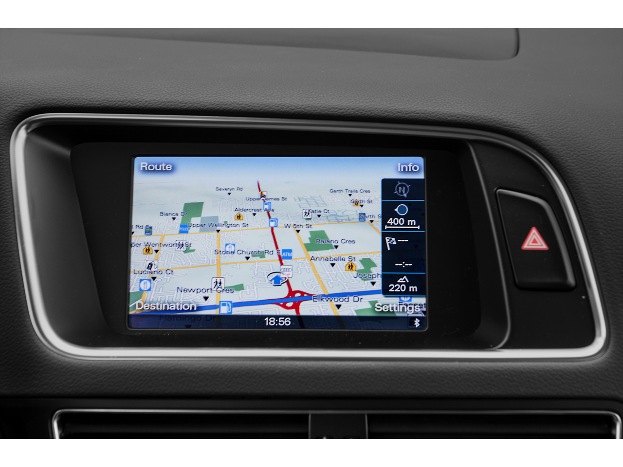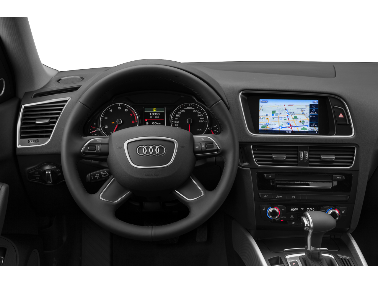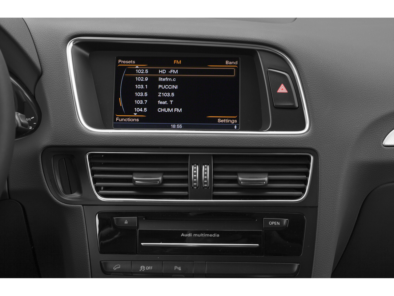 This 2015 Audi Q5 is equipped with Black Leather, 10 Speakers, 2.84 Axle Ratio, 4-Wheel Disc Brakes, ABS brakes, Air Conditioning, Alloy wheels, AM/FM radio, Automatic temperature control, Brake assist, Bumpers: body-color, CD player, Delay-off headlights, Driver door bin, Driver vanity mirror, Dual front impact airbags, Dual front side impact airbags, Electronic Stability Control, Four wheel independent suspension, Front anti-roll bar, Front Bucket Seats, Front Center Armrest, Front dual zone A/C, Front fog lights, Front reading lights, Garage door transmitter: HomeLink, Genuine wood console insert, Genuine wood dashboard insert, Genuine wood door panel insert, Heated door mirrors, High intensity discharge headlights: Xenon plus, Illuminated entry, Leather Seating Surfaces, Leather Shift Knob, Leather steering wheel, Low tire pressure warning, Occupant sensing airbag, Outside temperature display, Overhead airbag, Overhead console, Panic alarm, Passenger door bin, Passenger vanity mirror, Power door mirrors, Power driver seat, Power Front Bucket Seats, Power Liftgate, Power passenger seat, Power steering, Power windows, Radio data system, Radio: Audi MMI Plus System w/6.5 Color Screen, Rain sensing wipers, Rear air conditioning, Rear anti-roll bar, Rear fog lights, Rear reading lights, Rear seat center armrest, Rear window defroster, Rear window wiper, Remote keyless entry, Roof rack, Security system, Speed control, Speed-sensing steering, Speed-Sensitive Wipers, Split folding rear seat, Spoiler, Steering wheel mounted audio controls, Tachometer, Telescoping steering wheel, Tilt steering wheel, Traction control, Trip computer, Turn signal indicator mirrors, Variably intermittent wipers, and Wheels: 8.0J x 18 5-V-Spoke-Design.
