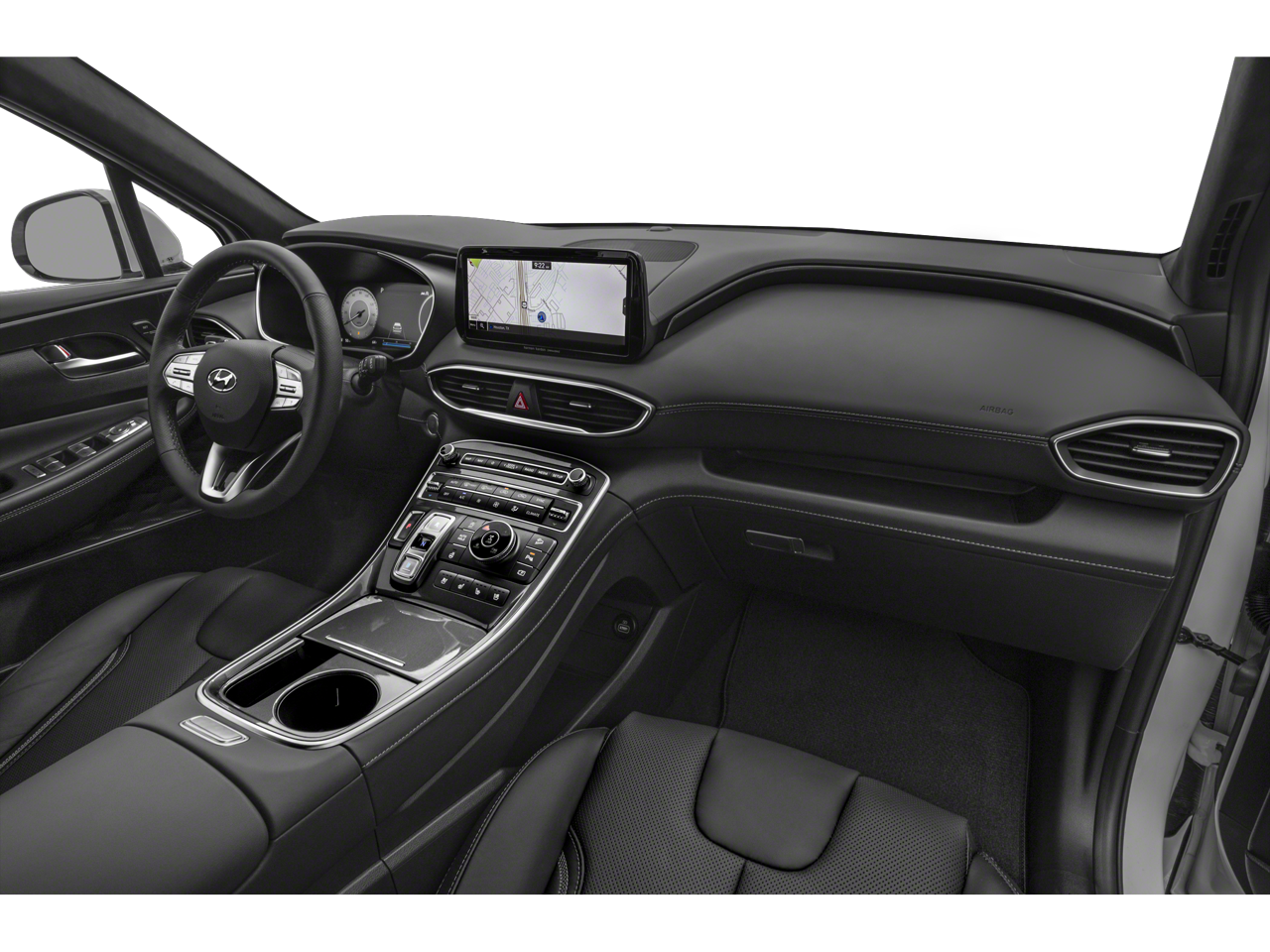 This 2021 Hyundai Santa Fe is equipped with Cargo Package (Cargo Net, Cargo Tray, and First Aid Kit), Option Group 01, AWD, Black Leather, Navigation System, 12 Speakers, 4-Wheel Disc Brakes, ABS brakes, Air Conditioning, Alloy wheels, AM/FM radio: SiriusXM, Apple CarPlay & Android Auto, Auto High-beam Headlights, Auto-dimming Rear-View mirror, Automatic temperature control, Axle Ratio: 3.316, Brake assist, Bumper Applique, Bumpers: body-color, Cargo Cover/Screen, Carpeted Floor Mats, Delay-off headlights, Driver door bin, Driver vanity mirror, Dual front impact airbags, Dual front side impact airbags, Electronic Stability Control, Emergency communication system, Four wheel independent suspension, Front anti-roll bar, Front Bucket Seats, Front Center Armrest, Front dual zone A/C, Front reading lights, Fully automatic headlights, Garage door transmitter: HomeLink, harman/kardon® Speakers, Heads-Up Display, Heated & Ventilated Front Bucket Seats, Heated door mirrors, Heated front seats, Heated rear seats, Heated steering wheel, Illuminated entry, Leather steering wheel, Low tire pressure warning, Memory seat, Occupant sensing airbag, Outside temperature display, Overhead airbag, Overhead console, Panic alarm, Passenger door bin, Passenger vanity mirror, Power door mirrors, Power driver seat, Power Liftgate, Power moonroof, Power passenger seat, Power steering, Power windows, Quilted Nappa Leather Seat Trim, Radio: AM/FM/MP3 Harman Kardon Display Audio, Rain sensing wipers, Rear anti-roll bar, Rear seat center armrest, Rear window defroster, Rear window wiper, Remote keyless entry, Security system, Speed control, Speed-sensing steering, Split folding rear seat, Spoiler, Steering wheel mounted audio controls, Tachometer, Telescoping steering wheel, Tilt steering wheel, Traction control, Trip computer, Turn signal indicator mirrors, Variably intermittent wipers, Ventilated front seats, Wheel Locks, and Wheels: 19 x 7.5J Alloy.