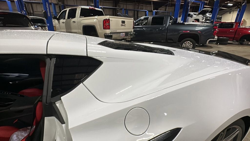 This 2023 Chevrolet Corvette is equipped with Battery Protection Package, Carbon Flash Metallic Painted Outside Mirrors (Carbon Flash Metallic-Painted Outside Mirrors), Preferred Equipment Group 1LZ, 10 Speakers, 4-Wheel Disc Brakes, 8-Way Power Driver Seat Adjuster, 8-Way Power Passenger Seat Adjuster, ABS brakes, Adaptive suspension, Air Conditioning, Alloy wheels, AM/FM radio: SiriusXM, Apple CarPlay/Android Auto, Automatic temperature control, Black Exhaust Tips, Bose Premium 10-Speaker Audio System Feature, Brake assist, Bright Red-Painted Calipers, Bumpers: body-color, Compass, Delay-off headlights, Driver door bin, Driver vanity mirror, Dual front impact airbags, Dual front side impact airbags, Electronic Stability Control, Emergency communication system: OnStar and Chevrolet connected services capable, Four wheel independent suspension, Front anti-roll bar, Front Bucket Seats, Front Center Armrest, Front dual zone A/C, Front reading lights, Fully automatic headlights, GT1 Bucket Seats, HD Radio, Heads-Up Display, Heated door mirrors, Illuminated entry, Leather Shift Knob, Leather steering wheel, Low tire pressure warning, Mulan Lthr Seating Surfaces w/Perforated Inserts, Occupant sensing airbag, Outside temperature display, Overhead console, Panic alarm, Passenger door bin, Passenger vanity mirror, Power door mirrors, Power driver seat, Power passenger seat, Power steering, Power windows, Premium audio system: Chevrolet Infotainment 3 Plus, Radio data system, Radio: Chevrolet Infotainment 3 Plus System, Rear anti-roll bar, Rear window defroster, Remote keyless entry, SiriusXM Radio, Speed control, Speed-sensing steering, Spoiler, Sport steering wheel, Steering wheel mounted audio controls, Tachometer, Telescoping steering wheel, Tilt steering wheel, Traction control, Trip computer, Turn signal indicator mirrors, Variably intermittent wipers, Voltmeter, and Wheels: 20 x 10 Fr/21 x 13 Rr Titanium Satin.