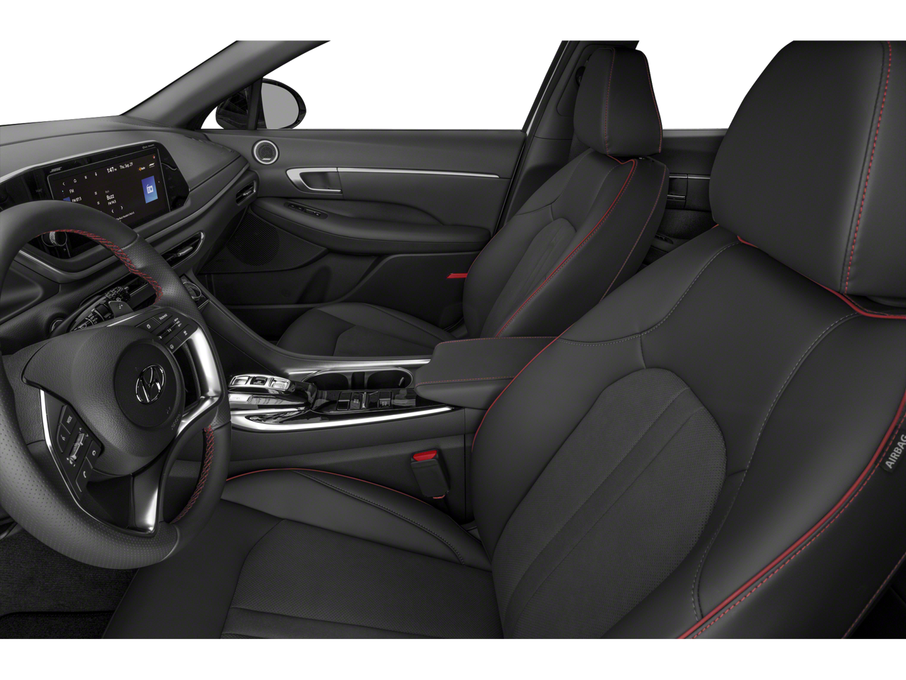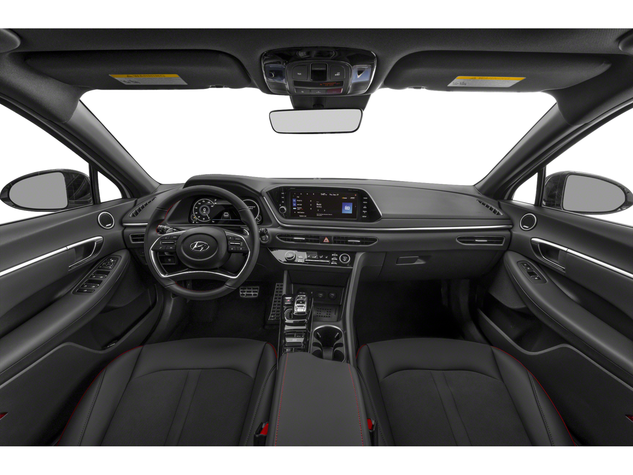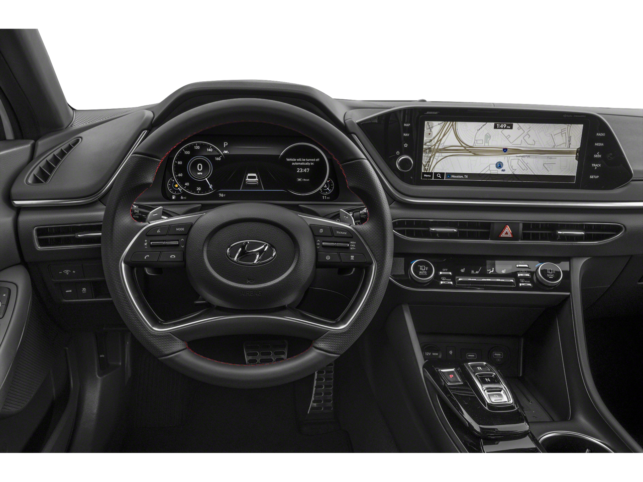 This 2023 Hyundai Sonata is equipped with Option Group 01, Preferred Accessory Package (Cargo Block, Cargo Side Bins, and First Aid Kit), Black Artificial Leather, Navigation System, 12 Speakers, 19 x 8.0J Aluminum Alloy Wheels, 4-Wheel Disc Brakes, ABS brakes, Air Conditioning, Alloy wheels, AM/FM radio: SiriusXM, Apple CarPlay & Android Auto, Auto High-beam Headlights, Auto-dimming Rear-View mirror, Automatic temperature control, Brake assist, Bumpers: body-color, Carpeted Floor Mats, Delay-off headlights, Driver door bin, Driver vanity mirror, Dual front impact airbags, Dual front side impact airbags, Electronic Stability Control, Emergency communication system: Blue Link Connected Car Service (3-year complimentary subscription), Exterior Parking Camera Rear, Four wheel independent suspension, Front anti-roll bar, Front Bucket Seats, Front Center Armrest, Front dual zone A/C, Front reading lights, Fully automatic headlights, Heated door mirrors, Heated Front Bucket Seats, Heated front seats, Illuminated entry, Knee airbag, Leather steering wheel, Leatherette/Suede Combination Seating Surfaces, Low tire pressure warning, Occupant sensing airbag, Outside temperature display, Overhead airbag, Overhead console, Panic alarm, Passenger door bin, Passenger vanity mirror, Power door mirrors, Power driver seat, Power moonroof, Power steering, Power windows, Radio data system, Radio: AM/FM/MP3/HD/SiriusXM Display Audio w/Nav, Rear anti-roll bar, Rear seat center armrest, Rear side impact airbag, Rear window defroster, Remote keyless entry, Security system, Speed control, Speed-sensing steering, Speed-Sensitive Wipers, Split folding rear seat, Steering wheel mounted audio controls, Tachometer, Telescoping steering wheel, Tilt steering wheel, Traction control, Trip computer, Trunk Cargo Net, Turn signal indicator mirrors, and Variably intermittent wipers.