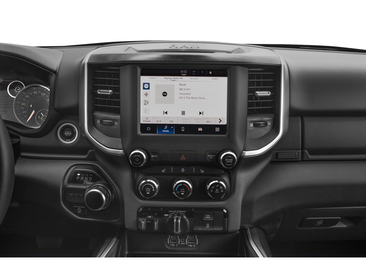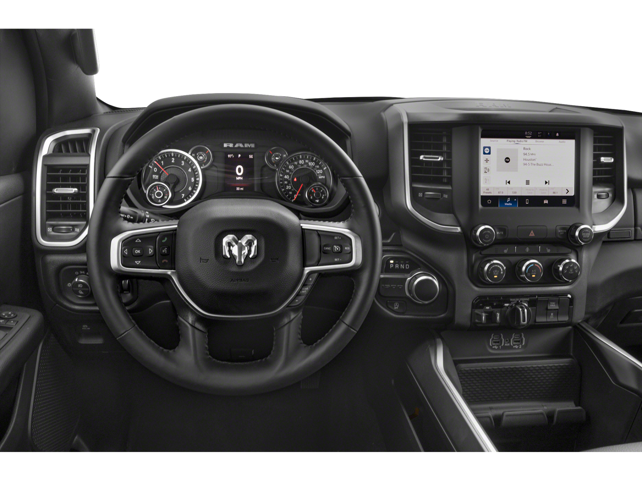 This 2023 Ram 1500 is equipped with Big Horn Level 1 Equipment Group (2nd Row In Floor Storage Bins, 4G LTE Wi-Fi Hot Spot, 8.4 Touchscreen Display, Apple CarPlay, Auto-Dimming Exterior Driver Mirror, Auto-Dimming Rear-View Mirror, Black Exterior Mirrors, Black Premium Power Mirrors, Bluetooth® Handsfree Phone & Audio, Class IV Receiver Hitch, Connectivity - US/Canada, Convex Wide-Angle Exterior Mirror Insert, Electric Shift-On-Demand Transfer Case, Exterior Mirrors Courtesy Lamps, Exterior Mirrors w/Heating Element, Exterior Mirrors w/Supplemental Signals, For Details, Visit DriveUconnect.com, For More Info, Call 800-643-2112, Front Fog Lamps, Glove Box Lamp, Google Android Auto, GPS Antenna Input, Heated Front Seats, Heated Steering Wheel, Integrated Center Stack Radio, Passenger Sun Visor w/Illuminated Mirror, Power-Folding Mirrors, Radio: Uconnect 5 W w/8.4 Display, Rear Dome w/On/Off Switch Lamp, Rear Power Sliding Window, Rear Window Defroster, SiriusXM Satellite Radio, and USB Host Flip), Level 1 Safety Group (Advanced Brake Assist, Full Speed Forward Collision Warning Plus, Lane Keep Assist, and Pedestrian Emergency Braking), Off Road Group (E-Locker Rear Axle, Front Extra HD Shock Absorbers, Off Road Decals, Raised Ride Height, Rear Extra HD Shock Absorbers, Selec-Speed (TM) Control, and Tow Hooks), Quick Order Package 27Z Big Horn (Big Horn Badge), 115V Auxiliary Power Outlet, 3 Rear Seat Head Restraints, 3.21 Rear Axle Ratio, 4 Way Front Headrests, 4-Wheel Disc Brakes, 48V Belt Starter Generator, 6 Speakers, ABS brakes, Active Noise Control System, Air Conditioning, Alloy wheels, AM/FM radio, Brake assist, Bumpers: chrome, Cloth Bench Seat, Compass, Delay-off headlights, Driver door bin, Dual front impact airbags, Dual front side impact airbags, Dual Rear Exhaust w/Bright Tips, Electronic Stability Control, Emergency communication system: SiriusXM Guardian, Front anti-roll bar, Front Center Armrest w/Storage, Front License Plate Bracket, Front reading lights, Front Seat Back Map Pockets, Front wheel independent suspension, Fully automatic headlights, Global Telematics Box Module (TBM), Heated door mirrors, Heavy-Duty Engine Cooling, HEMI Badge, Illuminated entry, Integrated Voice Command w/Bluetooth®, Leather steering wheel, Low tire pressure warning, Manufacturer's Statement of Origin, MOPAR Front & Rear Rubber Floor Mats, Occupant sensing airbag, Outside temperature display, Overhead airbag, Overhead console, Panic alarm, ParkSense Front/Rear Park Assist w/Stop, ParkView Rear Back-Up Camera, Passenger door bin, Passenger vanity mirror, Power door mirrors, Power steering, Power windows, Radio data system, Radio: Uconnect 3 w/5 Display, RAM Grille Badge - Chrome, Rear 60/40 Folding Seat, Rear anti-roll bar, Rear seat center armrest, Rear step bumper, Remote keyless entry, Speed control, Split folding rear seat, Steering wheel mounted audio controls, Tachometer, Telescoping steering wheel, Tilt steering wheel, Traction control, Trailer Brake Control, Trip computer, Variably intermittent wipers, Voltmeter, Wheel to Wheel Side Steps, and Wheels: 18 x 8 Cast-Aluminum PainteD.