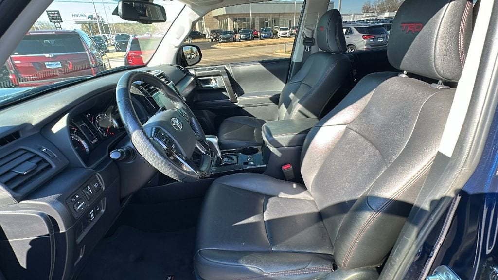 This 2023 Toyota 4Runner is equipped with 4WD, Black/Graphite w/Leather Seat Trim, Navigation System, 3.727 Axle Ratio, 4-Wheel Disc Brakes, 8 Speakers, ABS brakes, Air Conditioning, Alloy wheels, AM/FM radio: SiriusXM, Anti-whiplash front head restraints, Apple CarPlay/Android Auto, Auto High-beam Headlights, Auto-dimming Rear-View mirror, Black Roof Rails, Brake assist, Bumpers: body-color, Compass, Driver door bin, Driver vanity mirror, Dual front impact airbags, Dual front side impact airbags, Electronic Stability Control, Emergency communication system: Safety Connect (1-year trial), Exterior Parking Camera Rear, Front anti-roll bar, Front Bucket Seats, Front Center Armrest, Front fog lights, Front reading lights, Front wheel independent suspension, Garage Door Opener, Garage door transmitter: HomeLink, Heated door mirrors, Heated Front Bucket Seats, Heated front seats, Heated Outside Rear-View Mirrors, Illuminated entry, Knee airbag, Leather Shift Knob, Low tire pressure warning, Occupant sensing airbag, Outside temperature display, Overhead airbag, Overhead console, Panic alarm, Passenger door bin, Passenger vanity mirror, Power door mirrors, Power driver seat, Power passenger seat, Power steering, Power windows, Radio: Premium Audio w/Dynamic Navigation, Rear anti-roll bar, Rear seat center armrest, Rear window defroster, Rear window wiper, Remote keyless entry, Roof rack: rails only, Security system, SofTex Seat Trim, Speed control, Speed-sensing steering, Split folding rear seat, Spoiler, Steering wheel mounted audio controls, Tachometer, Telescoping steering wheel, Tilt steering wheel, Traction control, Trip computer, Turn signal indicator mirrors, Variably intermittent wipers, and Wheels: 17 Unique 7-Spoke Off-Road Alloy.