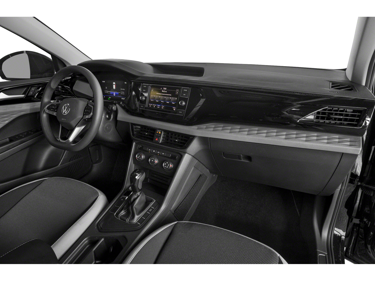 This 2023 Volkswagen Taos is equipped with 3.23 Axle Ratio, 4-Wheel Disc Brakes, 6 Speakers, ABS brakes, Air Conditioning, Alloy wheels, AM/FM radio, Brake assist, Bumpers: body-color, Cloth Seating Surfaces, Compass, Delay-off headlights, Driver door bin, Driver vanity mirror, Dual front impact airbags, Dual front side impact airbags, Electronic Stability Control, Emergency communication system: VW Car-Net Safe & Secure 5-year, Exterior Parking Camera Rear, Front anti-roll bar, Front Bucket Seats, Front Center Armrest, Front reading lights, Front Strut Rear Torsion Beam Suspension, Front wheel independent suspension, Fully automatic headlights, Illuminated entry, Low tire pressure warning, Occupant sensing airbag, Outside temperature display, Overhead airbag, Overhead console, Panic alarm, Passenger door bin, Passenger vanity mirror, Power door mirrors, Power steering, Power windows, Radio data system, Radio: Composition Color AM/FM, Rear anti-roll bar, Rear seat center armrest, Rear window defroster, Rear window wiper, Remote keyless entry, Roof rack: rails only, Speed control, Speed-sensing steering, Split folding rear seat, Spoiler, Steering wheel mounted audio controls, Tachometer, Telescoping steering wheel, Tilt steering wheel, Traction control, Trip computer, Variably intermittent wipers, and Wheels: 17 Silver Painted Alloy.