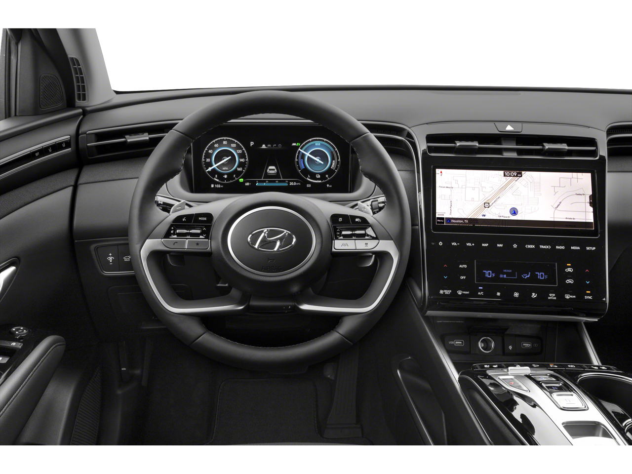 This 2024 Hyundai Tucson Hybrid is equipped with Option Group 01, Hyundai Certified Used Vehicles Certified, I4, Navigation System, 3.32 Axle Ratio, 4-Wheel Disc Brakes, 8 Speakers, ABS brakes, Air Conditioning, All Season Fitted Liners, Alloy wheels, AM/FM radio: SiriusXM, Apple CarPlay & Android Auto, Auto High-beam Headlights, Auto-dimming Rear-View mirror, Automatic temperature control, Brake assist, Bumpers: body-color, Cargo Net, Carpeted Floor Mats, Delay-off headlights, Driver door bin, Driver vanity mirror, Dual front impact airbags, Dual front side impact airbags, Electronic Stability Control, Emergency communication system, Exterior Parking Camera Rear, First Aid Kit, Four wheel independent suspension, Front anti-roll bar, Front Bucket Seats, Front Center Armrest, Front dual zone A/C, Front reading lights, Fully automatic headlights, Garage door transmitter: HomeLink, Heated & Ventilated Front Bucket Seats, Heated door mirrors, Heated front seats, Heated rear seats, Heated steering wheel, Illuminated entry, Leather Seat Trim, Low tire pressure warning, Memory seat, Occupant sensing airbag, Outside temperature display, Overhead airbag, Overhead console, Panic alarm, Passenger door bin, Passenger vanity mirror, Power door mirrors, Power driver seat, Power Liftgate, Power moonroof, Power passenger seat, Power steering, Power windows, Radio data system, Radio: Bose Premium w/AM/FM/HD Audio System, Rain sensing wipers, Rear anti-roll bar, Rear Bumper Applique, Rear reading lights, Rear seat center armrest, Rear side impact airbag, Rear window defroster, Rear window wiper, Remote keyless entry, Security system, Speed control, Split folding rear seat, Spoiler, Steering wheel mounted audio controls, Tachometer, Telescoping steering wheel, Tilt steering wheel, Traction control, Trip computer, Turn signal indicator mirrors, Variably intermittent wipers, Ventilated front seats, Wheel Locks, and Wheels: 19 x 7.5J Machine-Face Finish Alloy.
